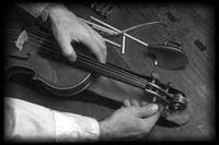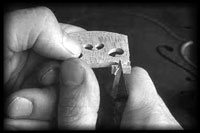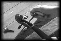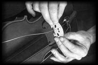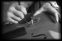 27.Sculpting the bridge with a penknife; this requires special care, for the sound and timbre of the instrument will depend a great deal on this little piece of wood. |
